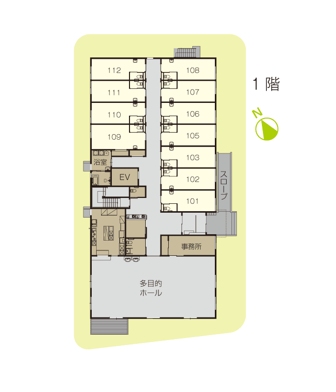 | ・安 全 | スプリンクラー・自動火災報知器設置10キー自動ドア開閉システムや全室バリアフリー設計でセキュリティーも万全です。 |